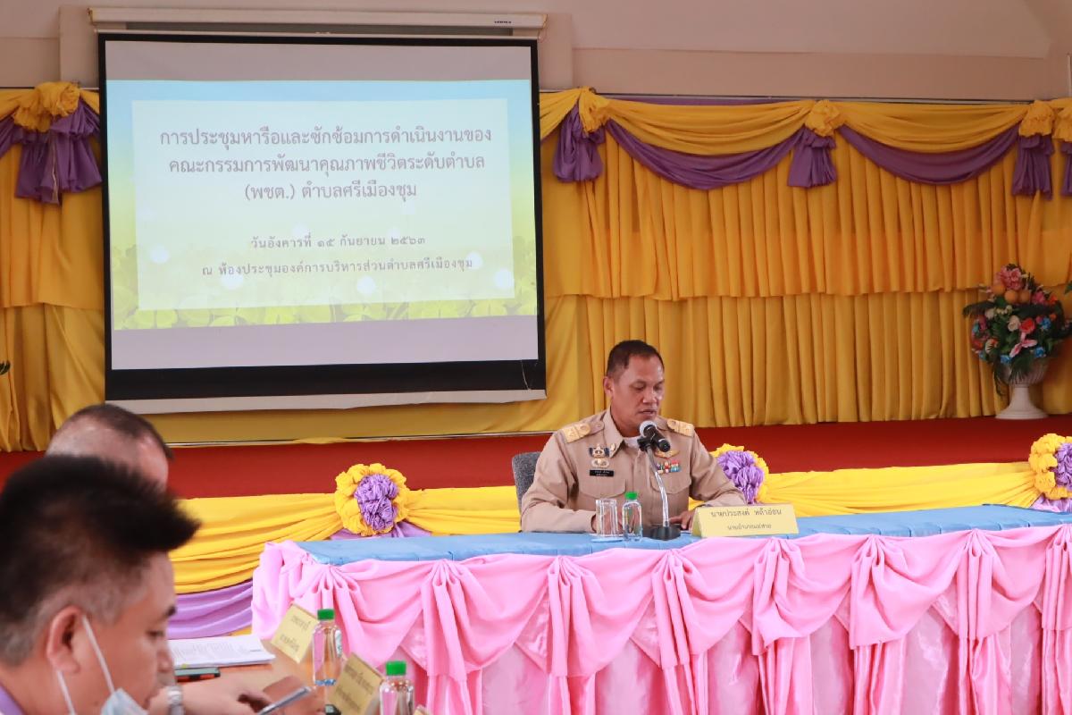 วันที่ 15 กันยายน 2563 นายประสงค์ หล้าอ่อน นายอำเภอแม่สาย ได้เป็นประธานในการประชุมหารือและซักซ้อมการดำเนินงานของคณะกรรมการพัฒนาคุณภาพชีวิตระดับตำบล มีผู้เข้าร่วมประชุมหลายภาคส่วน โดยการนำของ นายพัฒนะพงศ์ ลาพิงค์ นายกองค์การบริหารส่วนตำบลศรีเมืองชุม คณะผู้บริหาร สมาชิกสภาองค์การบริหารส่วนตำบลศรีเมืองชุม หัวหน้าส่วนทุกภาคส่วนในอำเภอแม่สาย หมวดลาดตระเวน กองกำลังผาเมือง ฐานปฏิบัติการบ้านทุ่งเกลี้ยง ผู้อำนวยการโรงเรียนบ้านสันถนน กำนัน ผู้ใหญ่บ้าน ประธาน อสม. ประธานแม่บ้าน ณ ห้องประชุมองค์การบริหารส่วนตำบลศรีเมืองชุม