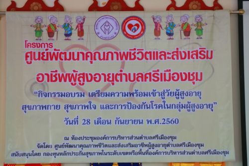 วันที่ 28 กันยายน 2560 นายพัฒนะพงศ์ ลาพิงค์ นายกองค์การบริหารส่วนตำบลศรีเมืองชุม ได้กล่าวเปิดโครงการ “ศูนย์พัฒนาคุณภาพชีวิตและส่งเสริมอาชีพผู้สูงอายุ”กิจกรรมอบรมเตรียมความพร้อมเข้าสู่วัยสูงอายุ เพื่อสุขภาพกาย สุขภาพใจและการป้องกันโรคในกลุ่มผู้สูงอายุ โดยมีนายเมือง ภีระบัน ประธานคณะกรรมการศูนย์พัฒนาคุณภาพชีวิตและส่งเสริมอาชีพผู้สูงอายุตำบลศรีเมืองชุม กล่าวรายงาน โดยโครงการดังกล่าวได้รับการสนับสนุนงบประมาณจากองทุนหลักระกันสุขภาพในระดับท้องถิ่นหรือพื้นที่องค์การบริหารส่วนตำบลศรีเมืองชุม มีกลุ่มเป้าหมายเป็นผู้ที่กำลังก้าวเข้าสู่วัยสูงอายุ (60 ปี)จำนวน 110 คน โดยมี นายเสาร์แก้ว ปวงศรี ข้าราชการครูชำนาญ เป็นวิทยากรให้ความรู้