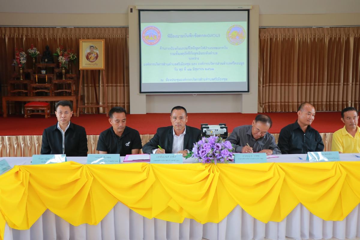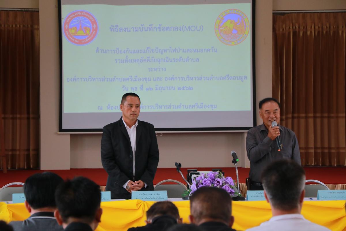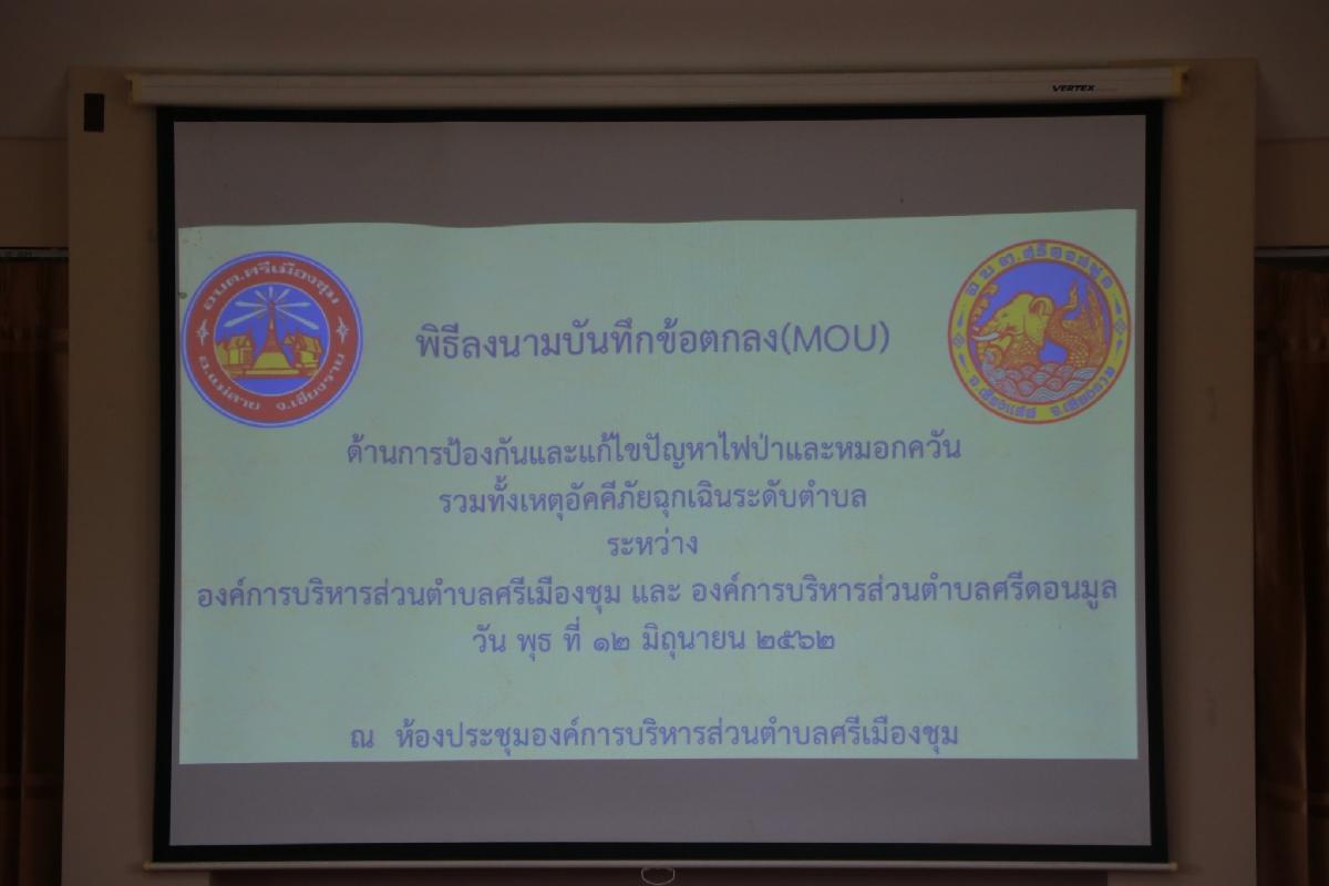 การลงนามบันทึกข้อตกลงความร่วมมือ(MOU) ด้านการป้องกันแก้ไขปัญหาไฟป่าและหมอกควัน รวมทั้งระงับเหตุอัคคีภัยฉุกเฉินระดับตำบล ระหว่างตำบลศำบลศรีเมืองชุมและตำบลศรีดอนมูล 2562