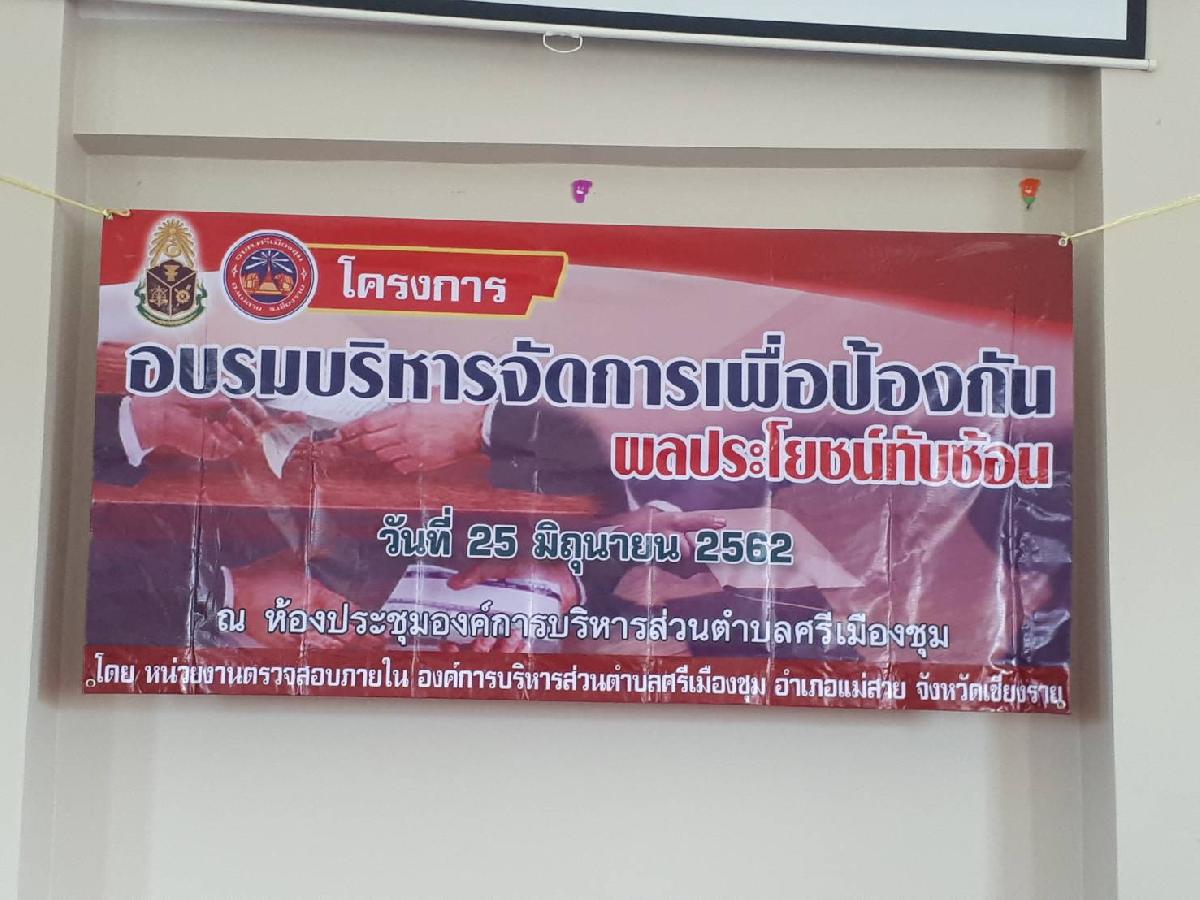 วันที่ 25 มิถุนายน 2562 องค์การบริหส่วนตำบลศรีเมืองชุม (หน่วยตรวจสอบภายใน) ได้โครงการอบรมบริหารจัดการเพื่อป้องกันผลประโยชน์ทับซ้อน