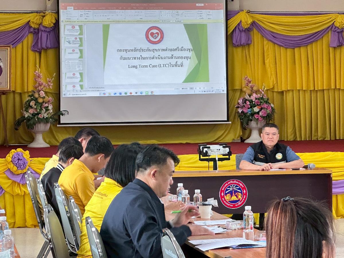 โดยมี เจ้าหน้าที่กองทุนหลักประกันสุขภาพตำบลศรีเมืองชุม และพยาบาลวิชาชีพ จาก โรงพยาบาลส่งเสริมสุขภาพตำบลศรีเมืองชุม ได้นำเสนอการขับเคลื่อนการบริหารจัดการระบบดูแลระยะยาวด้านสาธารณสุขสำหรับผู้สูงอายุที่มีภาวะพึ่งพิง (LTC) ให้แก่ผู้เข้าร่วมประชุมได้รับทราบเพื่อแลกเปลี่ยนเรียนรู้ในการดำเนินการ กองทุนฯ LTC
