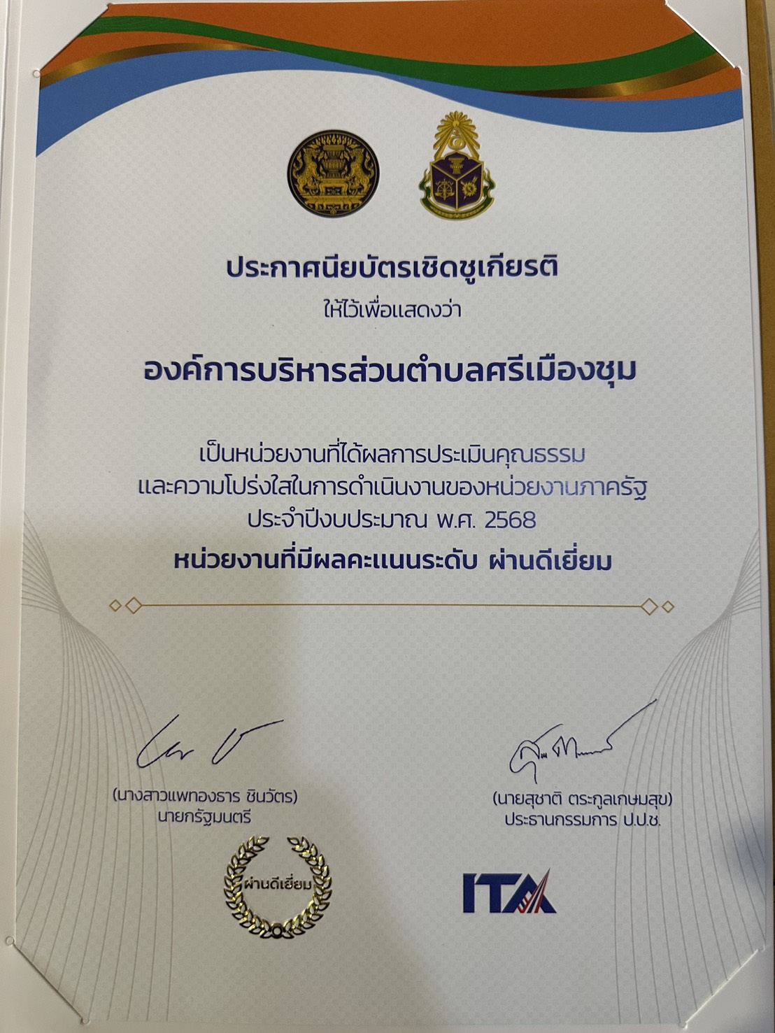 วันอังคารที่ 9 ธันวาคม 2568 ณ ห้องประชุมจอมกิตติ ชั้น 3 อาคารศาลากลางจังหวัดเชียงราย อำเภอเมืองเชียงราย จังหวัดเชียงราย นายอนุรักษ์ บุตรลักษณ์ ปลัดองค์การบริหารส่วนตำบลศรีเมืองชุมปฏิบัติหน้าที่นายกองค์การบริหารส่วนตำบลศรีเมืองชุม เข้ารับมอบเกียรติบัตรเชิดชูเกียรติแก่หน่วยงานที่มีผลการประเมินคุณธรรมและความโปร่งใสในการดำเนินงานของหน่วยงานภาครัฐ (ITA) ประจำปีงบประมาณ 2568 ระดับ "ผ่านดีเยี่ยม" จาก นายชูชีพ พงษ์ไชย ผู้ว่าราชการจังหวัดเชียงราย เป็นประธานในพิธีมอบ ในกิจกรรมวันต่อต้านคอร์รัปชันสากล (ประเทศไทย) ประกาศเจตจำนงในการต่อต้านการทุจริต ซึ่งองค์การบริหารส่วนตำบลศรีเมืองชุมได้รับคะแนนการประเมิน (ITA) ประจำปีงบประมาณ 2568 ระดับ "ผ่านดี โดยได้คะแนน 99.98 คะแนน จึงขอขอบคุณกำนันผู้ใหญ่บ้านทุกหมู่บ้าน ผู้นำท้องถิ่นท้องที่ทุกท่านรวมทั้งประชาชนในตำบลศรีเมืองชุมทุกคนที่ทำให้องค์การบริหารส่วนตำบลศรีเมืองชุมได้รับรางวัลเกียรติบัตรอันทรงคุณค่าดังกล่าวและทางหน่วยงานเองก็จะมุ่งมั่นพัฒนาการปฏิบัติราชการให้เป็นไปด้วยความสุจริตและโปร่งใสต่อต้านการทุจริตทุกรูปแบบ