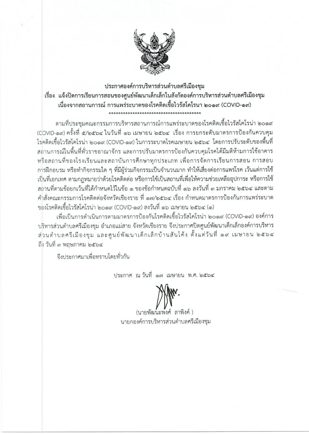 ประกาศองค์การบริหารส่วนตำบลศรีเมืองชุม เรื่อง แจ้งปิดการเรียนการสอนของศูนย์พัฒนาเด็กเล็กฯ