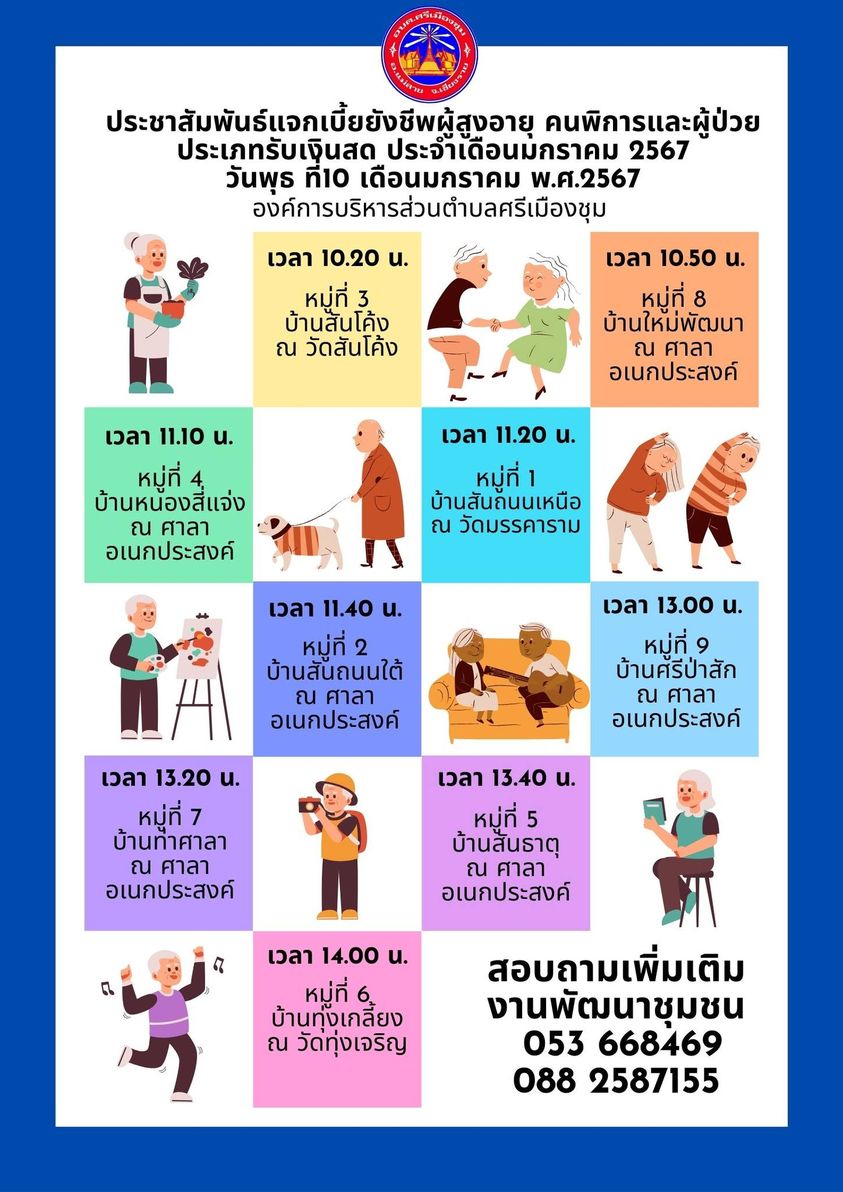 ประชาสัมพันธ์แจกเบี้ยยังชีพผู้สูงอายุ คนพิการและผู้ป่วย ประเภทรับเงินสด ประจำเดือนมกราคม 2567