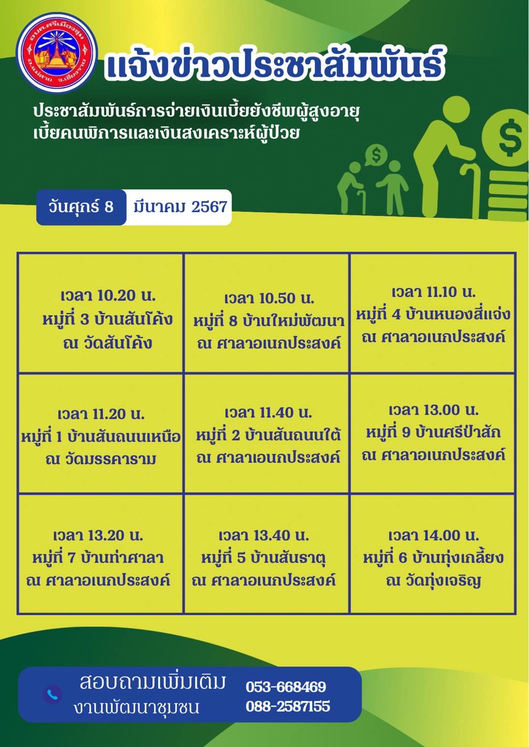 ประชาสัมพันธ์แจกเบี้ยยังชีพผู้สูงอายุ คนพิการและผู้ป่วย ประเภทรับเงินสด ประจำเดือนมีนาคม 2567